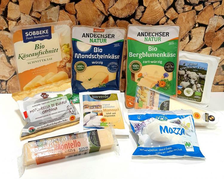 Schnittkäse, Blockkäse,Frischkäse, geriebener Käse, Büffel- und normaler Mozzarella, Parmesan, Gorgonzola, Back Camemebert, Feta und Manouri...... alles was das Käseherz höher schlagen lässt natürlich in Bio-Qualität